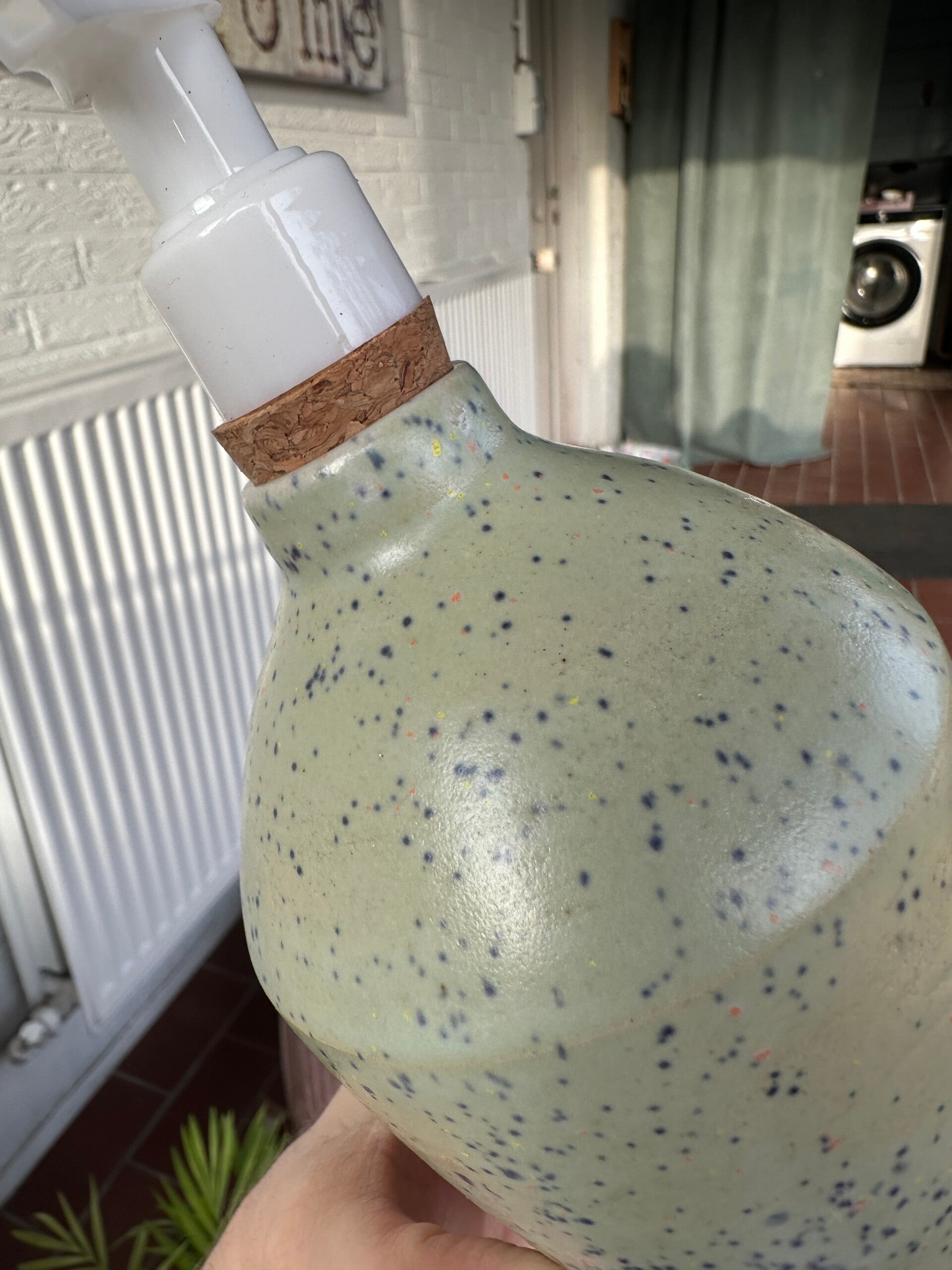 Mooi zeep flesje in mint groene kleur met gekleurde spikkels